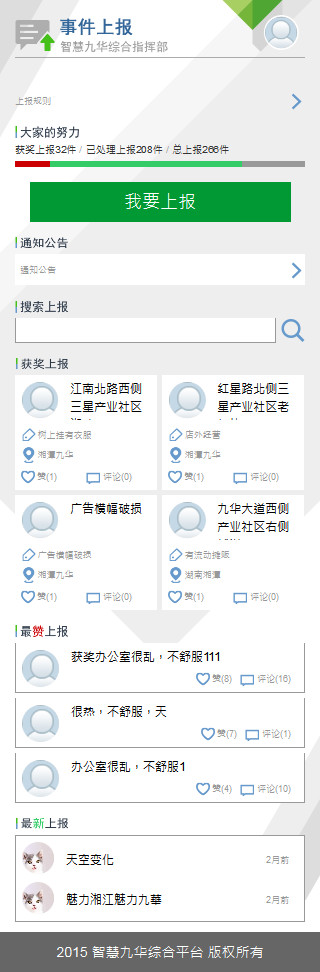 事件上報(bào)前臺主要功能有:提交上報(bào)、搜索上報(bào)、查看獲獎(jiǎng)上報(bào)、查看最贊上報(bào)、查看最新上報(bào)等操作。提交上報(bào)操作前須關(guān)注“九華人”微信公眾號,并進(jìn)行帳號注冊后才可進(jìn)行操作。