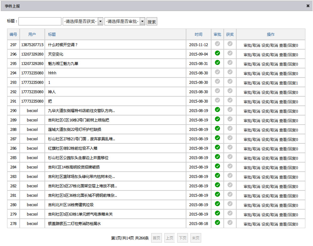 事件上報(bào)后臺主要功能有:收集所有上報(bào)數(shù)據(jù),并進(jìn)行查看上報(bào)、回復(fù)上報(bào)、上報(bào)審核、上報(bào)設(shè)獎(jiǎng)等操作。