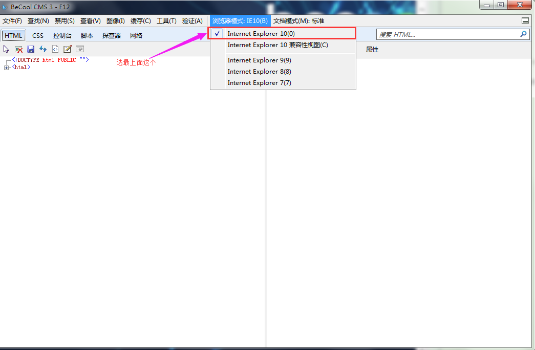 2. 看到瀏覽器模式和文檔模式,根據(jù)IE版本選擇對(duì)應(yīng)的模式。如IE10,瀏覽器模式默認(rèn)為IE10,文檔模式會(huì)默認(rèn)是標(biāo)準(zhǔn)模式。注意不要選擇有“兼容性視圖”的瀏覽器模式,文檔模式會(huì)隨之變?yōu)?/span>IE7或更低版本。    再將文檔模式設(shè)置為標(biāo)準(zhǔn)默認(rèn)模式。
