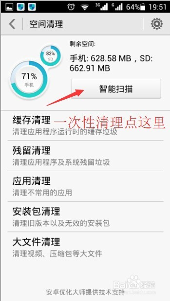 2. 點(diǎn)擊以后,出現(xiàn)了幾項(xiàng)不同的功能,有空間清理、手機(jī)加速等等,我們點(diǎn)擊“空間清理”,如圖所示。